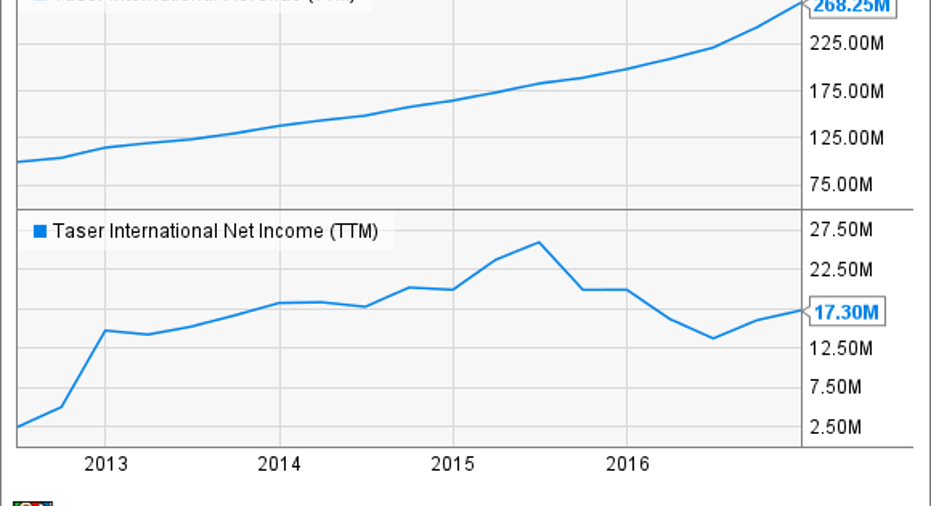 This trend will likely continue given the free body camera offer, which will likely cost millions, depending on the adoption rate. But if adoption of the body cameras and contracts for Evidence.com and other services increase after this offer, it could pay off in spades. The company recently stopped reporting Axon body camera service margins -- which include Evidence.com -- but in the past they've been as high as 80%. Giving away cameras in return for a multiyear service contract with 80% margins is a great trade in any business.