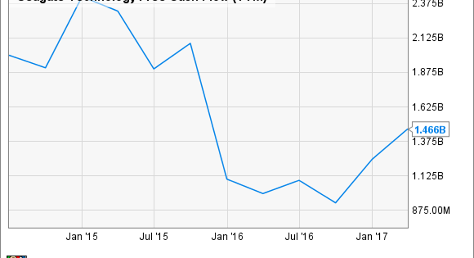 Those ratios look sustainable, but Seagate hasn't raised its dividend since 2015 due to cash flow concerns. However, Seagate's free cash flow has rebounded over the past year as data-heavy applications boosted demand for its enterprise storage products.