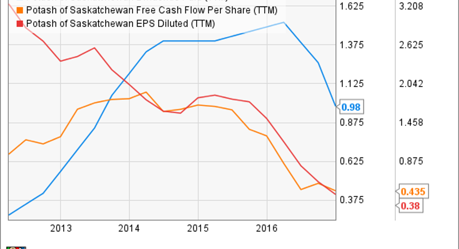 The worst, however, might be over for three reasons: recovering potash markets, declining capex and higher potential cash flows, and impending merger with Agrium that'll create the world's largest crop nutrient company. Both companies are confident of getting the regulatory go-ahead for the merger. If it goes through, Potash Corp. should become a financially stronger company with sustainable dividends thanks to Agrium's diversified portfolio and solid financial standing -- Agrium earned greater profits and free cash flows than Potash Corp. during the trailing 12 months.