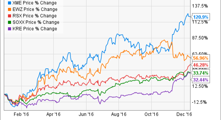 These general categories of ETFs weren't the only ones to produce strong returns in 2016, but they explain how most of the top ETFs of 2016 earned their places on the list. The same trends that created these good results in 2016 might well last into 2017, so it's worth taking a closer look at these winning ETFs now.