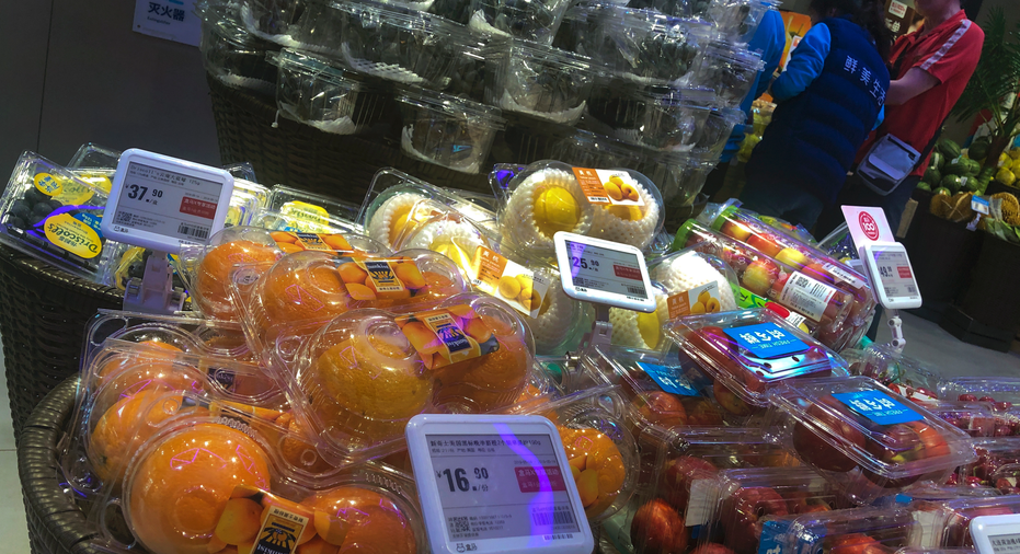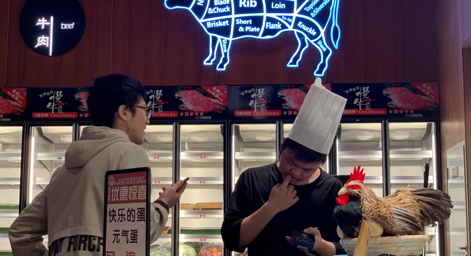 A worker at the imported beef section of a supermarket that used to carry U.S. products chats with another in Beijing on Tuesday, May 14, 2019. China announced higher tariffs Monday on $60 billion worth of American goods in retaliation for President Donald Trump's latest penalties on Chinese products. (AP Photo/Ng Han Guan)