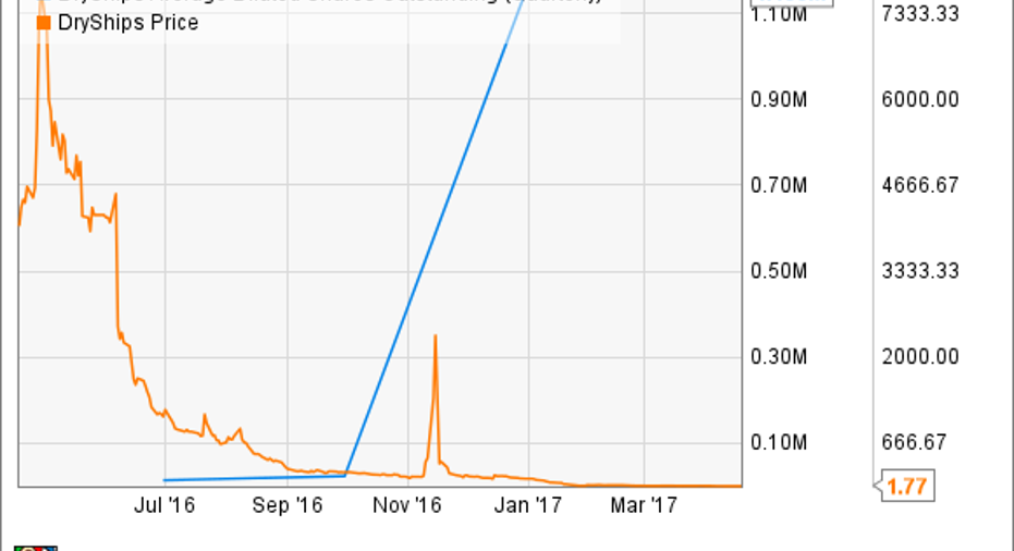 Meanwhile, after nearly sinking under the weight of debt from its previous buying boom, DryShips has taken a different approach to financing growth this time around by issuing equity. However, as the following chart shows, the company has diluted its stock right into the ground: