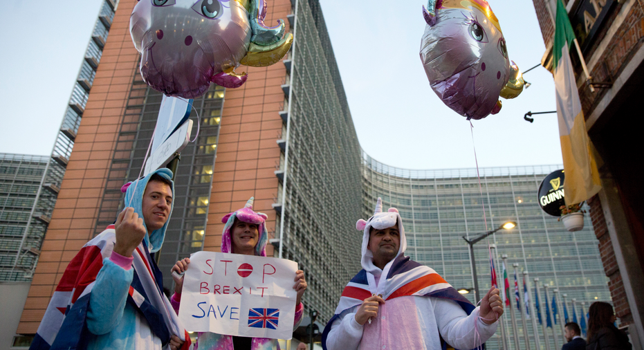 Protestors in costume and wearing Union and EU flags demonstrate about the process of Brexit outside EU headquarters in Brussels, Wednesday, Feb. 20, 2019. European Commission President Jean-Claude Juncker and British Prime Minister Theresa May met Wednesday for their latest negotiating session to seek an elusive breakthrough in Brexit negotiations. (AP Photo/Virginia Mayo)