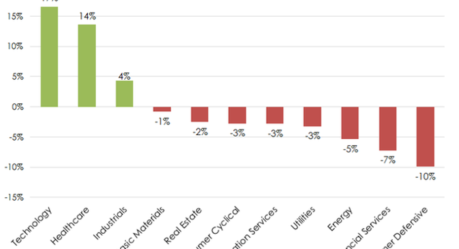 Technology and healthcare stocks are a staple of the Vanguard PRIMECAP Fund, making up about 54% of the fund on a combined basis, and 17% and 14% more of the fund than their weightings in the S&P 500 index, respectively. The fund shies away from financial services and consumer staples stocks, industries that typically have less earnings growth potential.