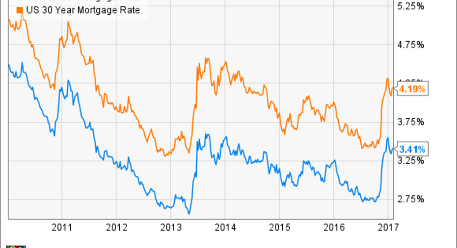 For this reason, 15-year mortgage interest rates tend to be significantly lower than 30-year rates. As I write this, a borrower with average credit can expect to find a 30-year mortgage with a 4.19% APR. With a 15-year mortgage, this same borrower can expect to pay 3.41%. As rates rise and fall, a similar gap tends to remain.