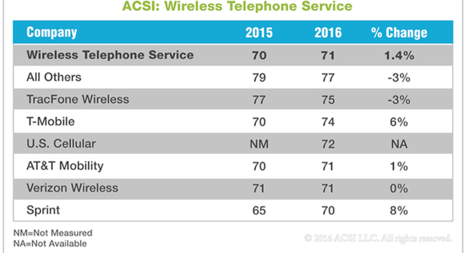 While the numbers are not overwhelming, T-Mobile did post the highest ACSI score of all the major carriers. Legere's company jumped from a 70 in 2015 to a 74 this year on the 100-point scale. That's a 6% jump that had the carrier topping AT&T and Verizon, which both scored 71, and Sprint, which brought up the rear at 70.