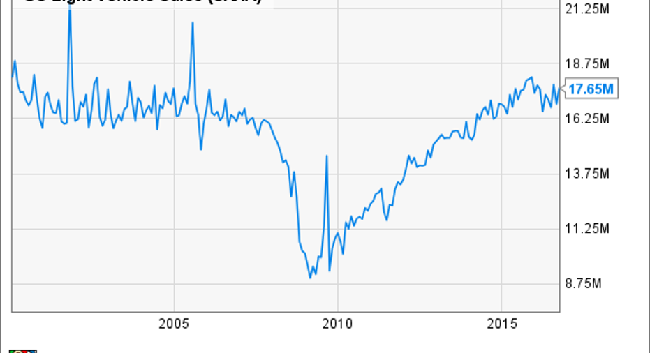 U.S. light-vehicle sales plateaued from 2000 through 2006, fell off a cliff in 2008, and didn't really recover to pre-recession levels until 2014. They went a little higher in 2015 and have slipped back a bit in 2016.