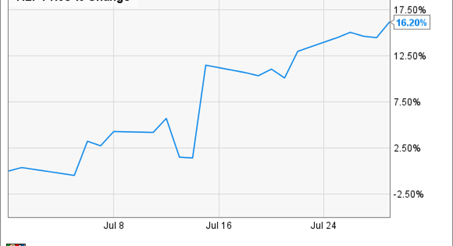 What:Shares ofHerbalife Ltd.(NYSE: HLF) surged last month as the company reached a settlement with the Federal Trade Commission over allegations of being a pyramid scheme. The FTC announced on July 15 that Herbalife would restructure its multilevel marketing operations and pay $200 million for consumer redress. As the chart below shows, the bulk of the company's gains came on July 15, the day that announcement was made.