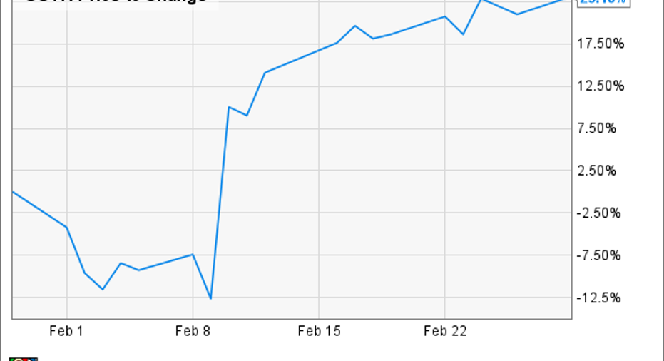 What:Shares of online retailerOverstock.com soared 23% last month, according to data from S&P Global Market Intelligence, jumping on its fourth-quarter earnings report. As you can see from the chart below, most of the stock's gains came on Feb. 10, following the release of the earnings report.