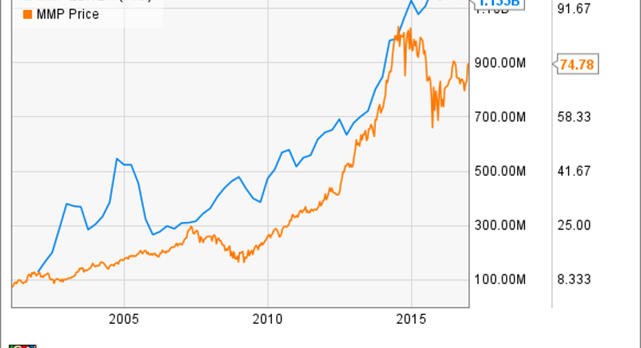 This past year would have been a whole lot worse if it weren't for the fact that 85% of Magellan Midstream Partners' operating margin comes from fee-based activities. In fact, one of the company's goals is to increase the percentage of its operating margin that comes from fee-based activates to reduce its direct exposure to commodity prices even further. That's why it has invested $850 million in organic growth projects in 2016, which should supply growing fee-based cash flow in 2017.