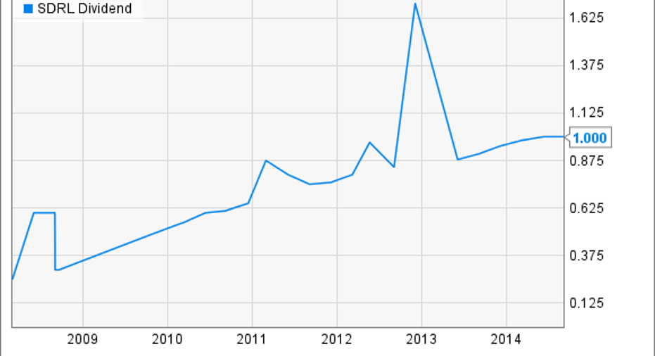 Until a couple of years ago, Seadrill had worked hard to build up a reputation for strong dividend growth. The company started out paying a $0.25 per share dividend in early 2008 and then quickly boosted it by more than double to $0.60 per share. The financial crisis in late 2008 led Seadrill to suspend payments for a year, but the company came back strong in late 2009, with dividends that started at $0.50 per share and worked their way higher over the years. A few special supplemental dividends also added to the amount of income shareholders got from Seadrill, which you can see as spikes in the graph below.