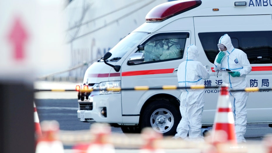 Officials in protective suits talk near the cruise ship Diamond Princess anchored at the Yokohama Port in Yokohama, south of Tokyo, Thursday, Feb. 6, 2020. (AP Photo/Eugene Hoshiko)