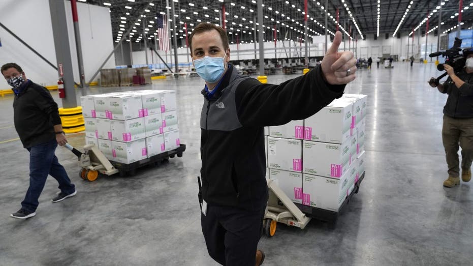 A worker gives a thumbs up while transporting boxes containing the Moderna COVID-19 vaccine to the loading dock for shipping at the McKesson distribution center in Olive Branch, Miss., Sunday, Dec. 20, 2020. (AP Photo/Paul Sancya, Pool)