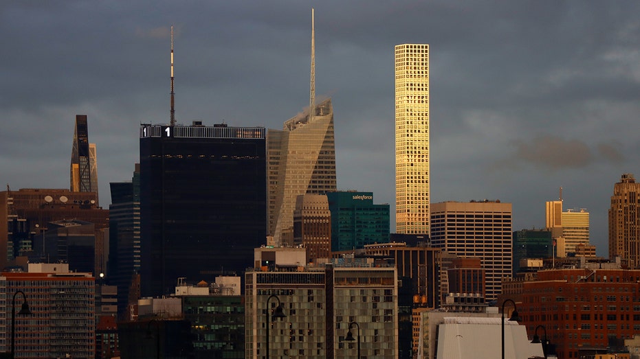 JERSEY CITY, NJ - OCTOBER 26: The sun sets on midtown Manhattan and 432 Park Avenue in New York City on October 26, 2021 as seen from Jersey City, New Jersey. (Photo by Gary Hershorn/Getty Images / Getty Images)