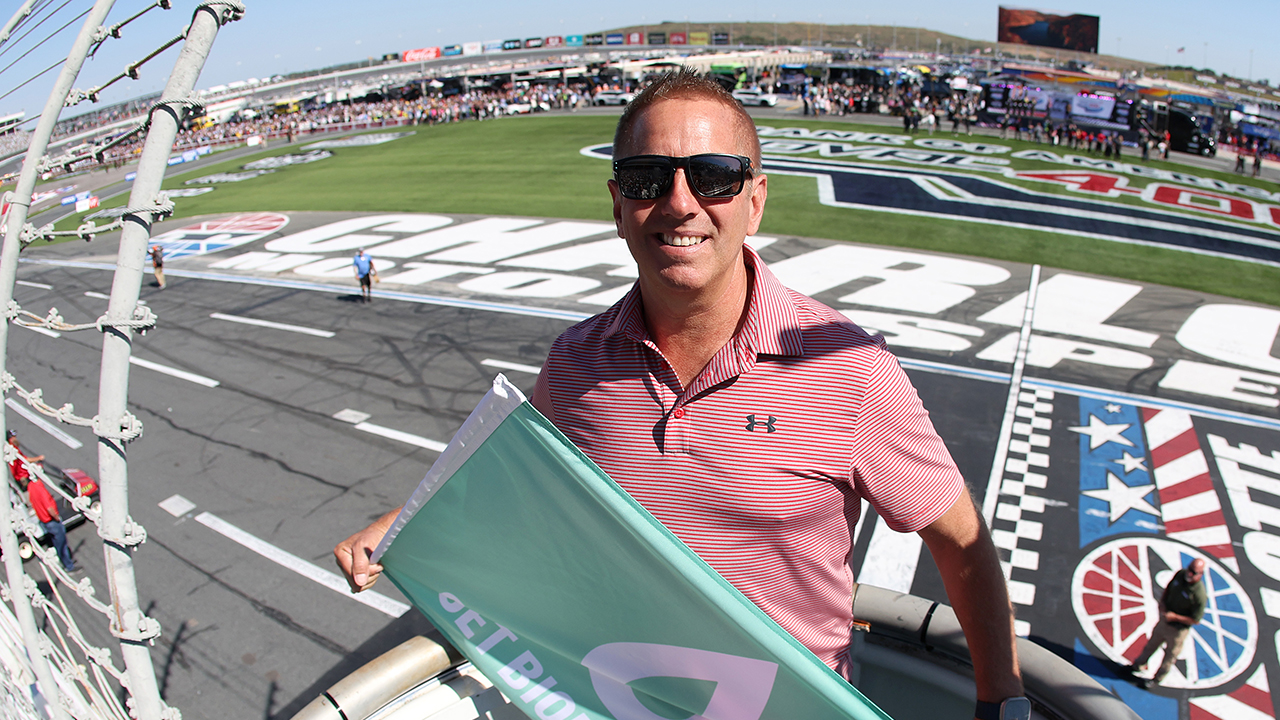 Greg Biffle poses with the green flag in the flagstand prior to the NASCAR Cup Series Bank of America ROVAL 400 at Charlotte Motor Speedway on Oct. 13, 2024, in Concord, North Carolina. (Meg Oliphant/Getty Images / Getty Images)