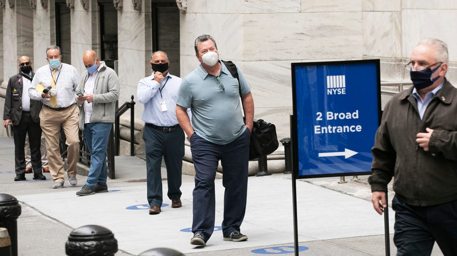 New York Stock Exchange employees wait to enter the building as the trading floor partially reopens, Tuesday, May 26, 2020. (AP Photo/Mark Lennihan)